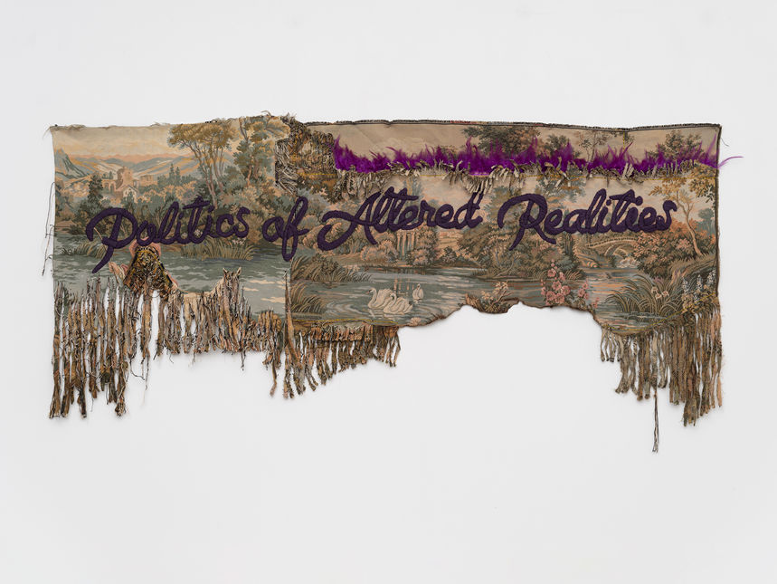 Known for her diverse practice, Jishkariani is especially recognized for her powerful tapestry works, which hold a central place in her oeuvre. She repurposes Soviet-era factory-made tapestries—once mass produced and now relics of the past found in flea markets—transforming them into sites of confrontation and catharsis. Her process is visceral: burning, tearing, and distorting the surface after meticulously embroidering phrases in English that oscillate between vulnerability, irony, and resistance. These phrases, while spare, carry deep emotional and political resonance, inviting multiple layers of interpretation. The laborious act of hand embroidery becomes a ritualistic process of personal release, as well as a critical engagement with collective memory in the post-Soviet space.